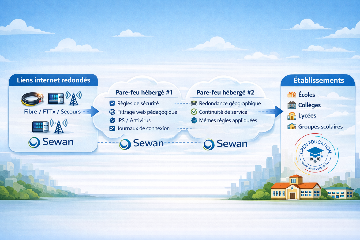 Très souples, nous offrons la possibilité aux établissements soit de confier également l’accès Internet/les liens WAN à Open Education,
